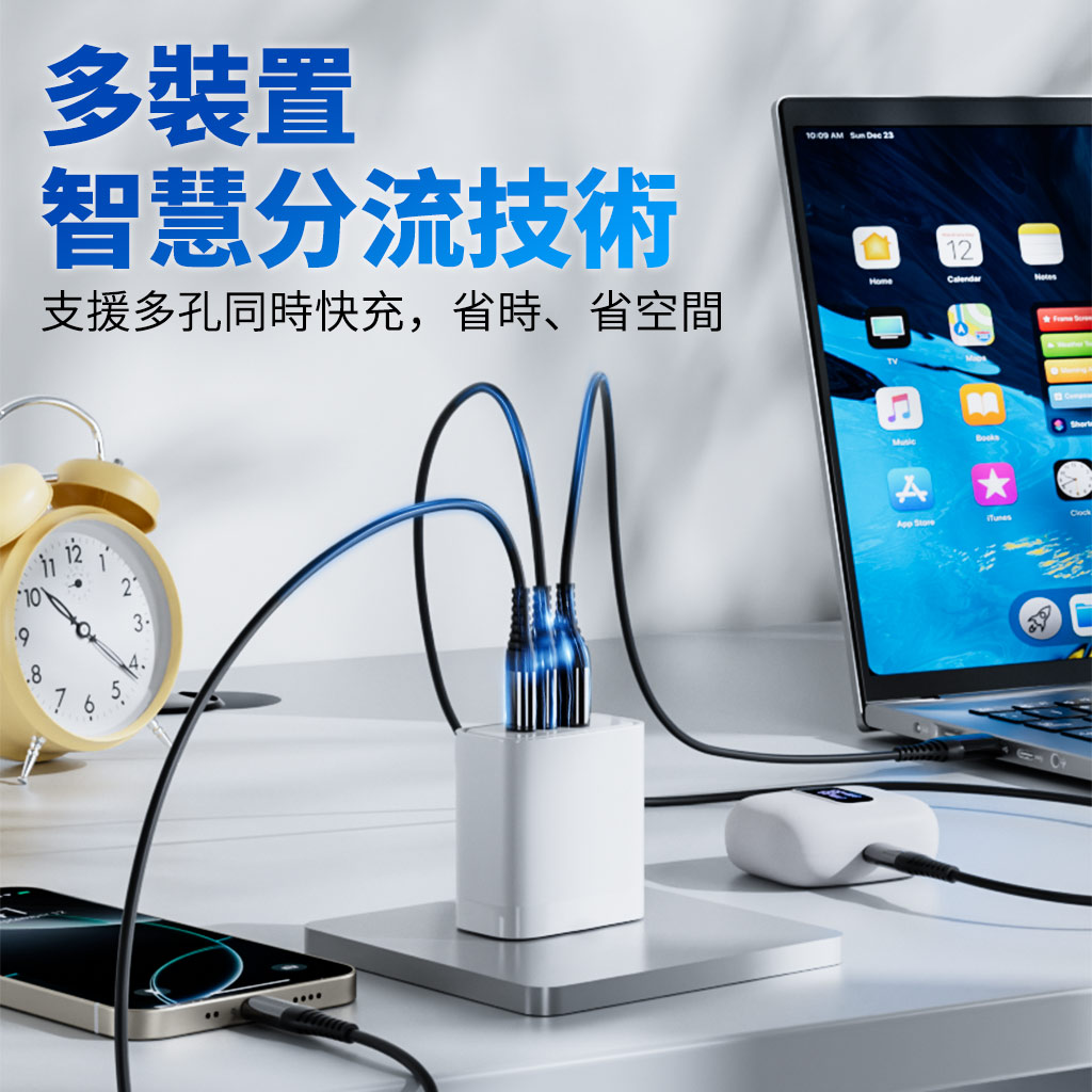 支援iPhone、iPad、Android手機、筆電等多種設備同時快充,智慧分流技術自動分配最佳充電功率,滿足不同設備充電需求。體積縮減50%但功率密度更高,攜帶便利適合商務出差及日常使用。