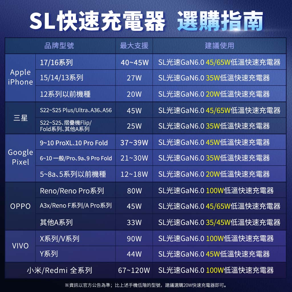選購65W推測3年內機種皆能符合快充極速,若想保留更長未來性,建議直上SL光速GaN6.0 100W快充頭