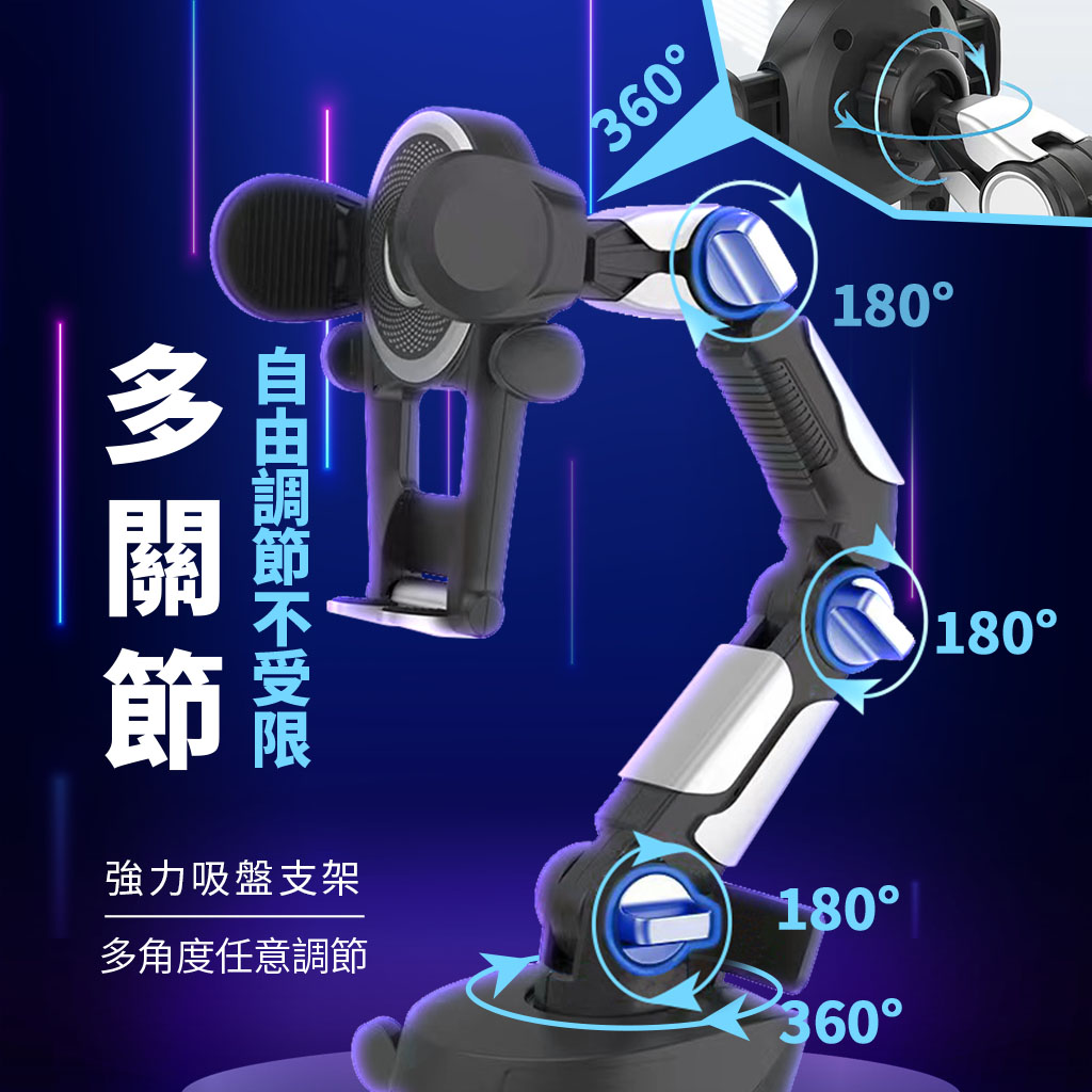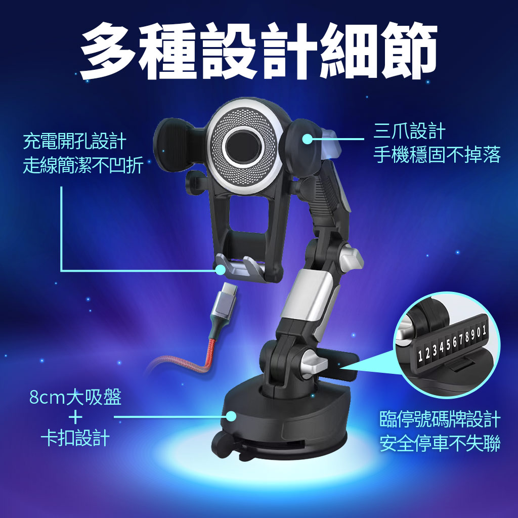 這款強力磁吸支架採用機械臂大吸盤設計,配備8cm大吸盤與卡扣設計提供超強穩固性 。產品具備多種設計細節,包含充電開孔設計確保走線簡潔不凹折,搭配三爪設計實現手機穩固不掉落 。