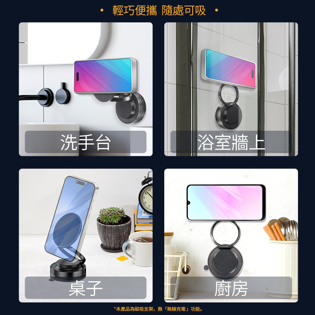 一體式折疊支架適用於車用玻璃、洗手台、浴室牆上、桌子、廚房等多種場景的平整表面,強力磁吸功能讓手機平板支架使用更便利 。真空磁吸手機架採用360度超強力磁吸技術,多功能摺疊設計實現懶人支架效果,磁吸旋轉支架可隨拿隨用,是桌面支架、車用支架、手機架的理想選擇 。