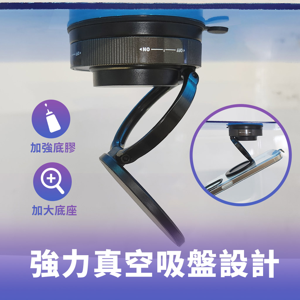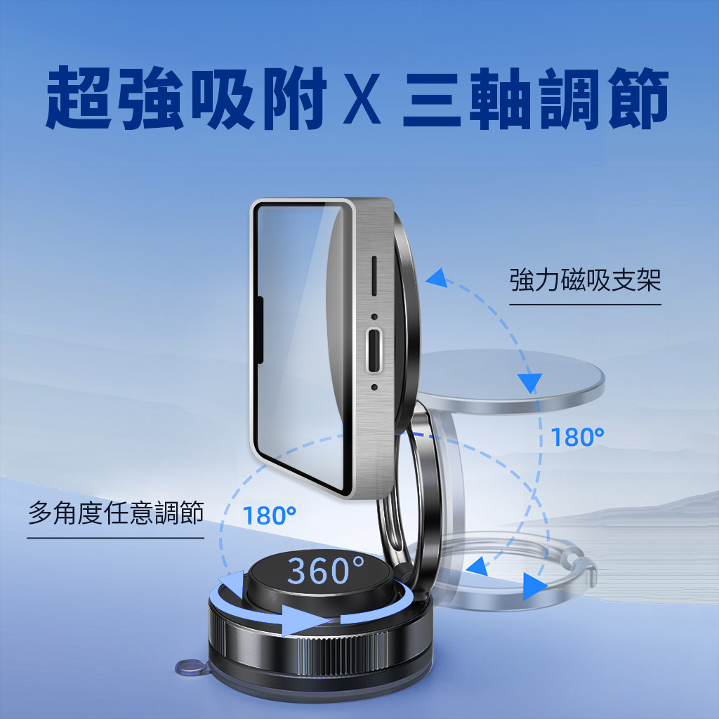 這款N52強力磁吸支架採用真空吸盤設計,具備輕巧便攜與隨處可吸特性,完整支架不須搭配其他配件即可使用 。產品具備360度旋轉與三軸調節功能,提供無死角的多角度任意調節,支援強力真空吸盤設計搭配加強底膠與加大底座,實現超強吸附穩固性 。