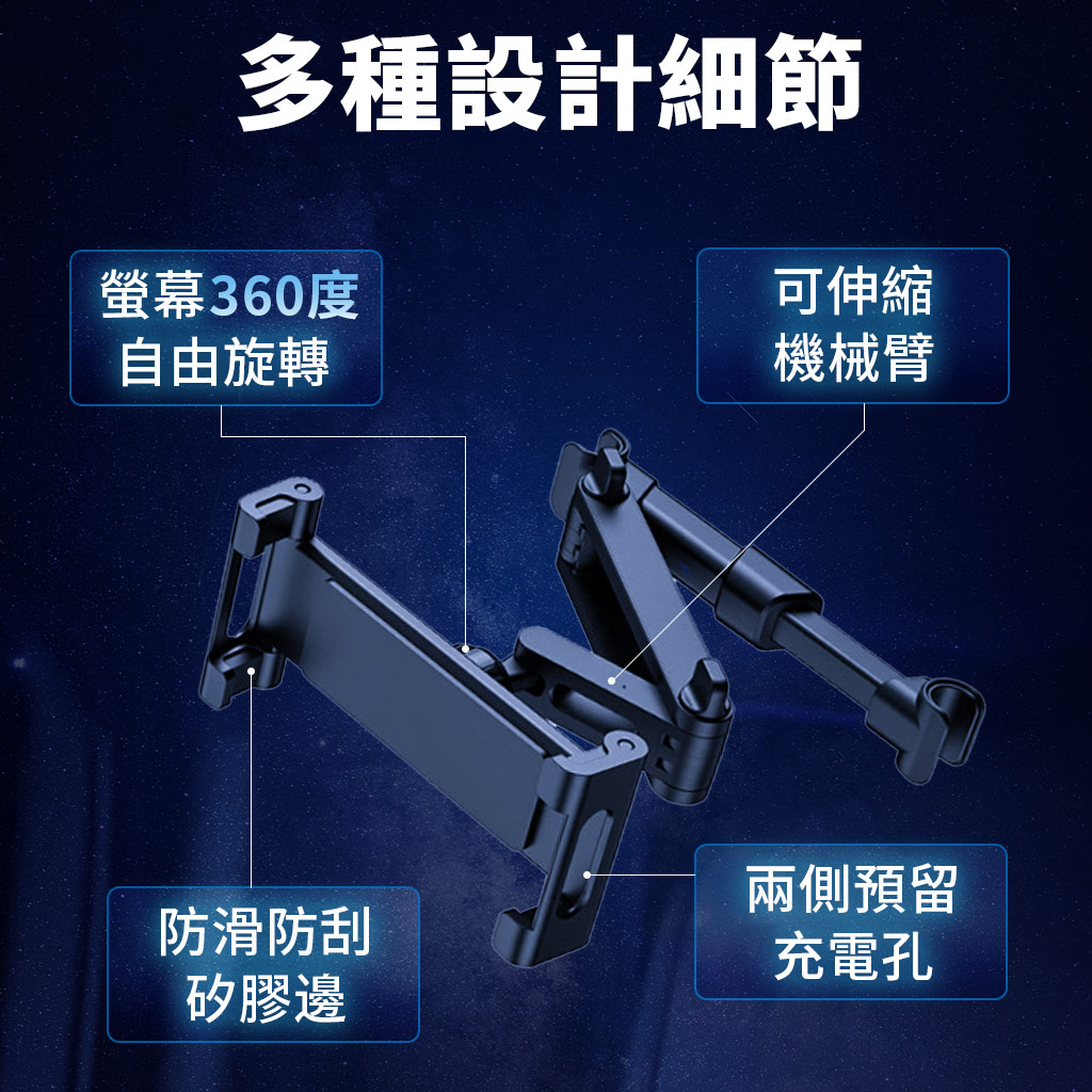 專業級車用後座娛樂支架,完整支架組免搭配其他配件即可使用。採用高強度加固材質製造,360度自由旋轉設計,滿足各種觀看角度需求。可伸縮機械臂結構,輕鬆調整至最佳觀賞距離。