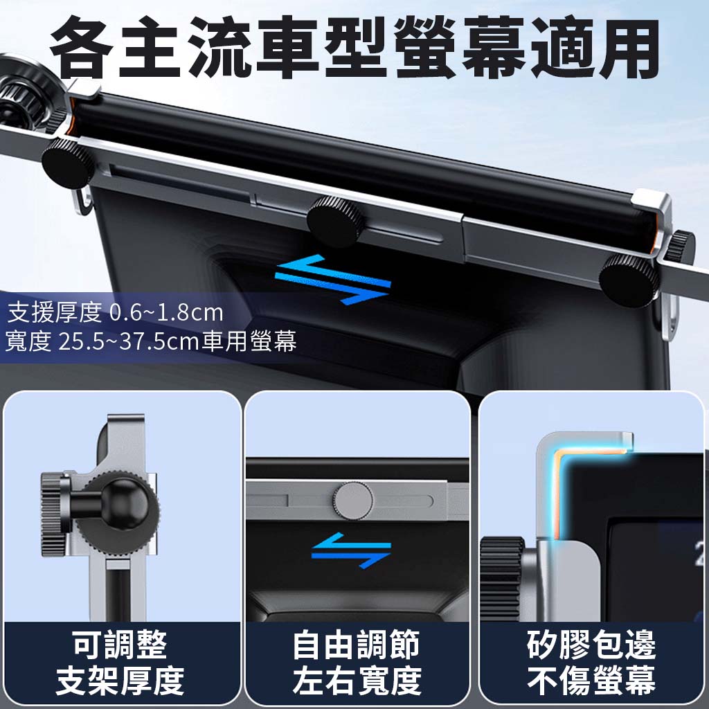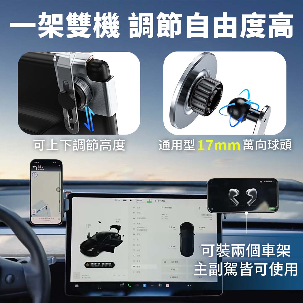 這是一款多功能2in1鋁合金車用支架,採用通用型設計,支援厚度0.6~1.8cm、寬度25.5~37.5cm的車用螢幕固定安裝。產品具備一架雙機功能,可於駕駛座及副駕駛座同時安裝兩個車用手機架或平板支架,透過17mm萬向球頭提供360度旋轉調節,實現上下高度調整與左右角度自由調節 。