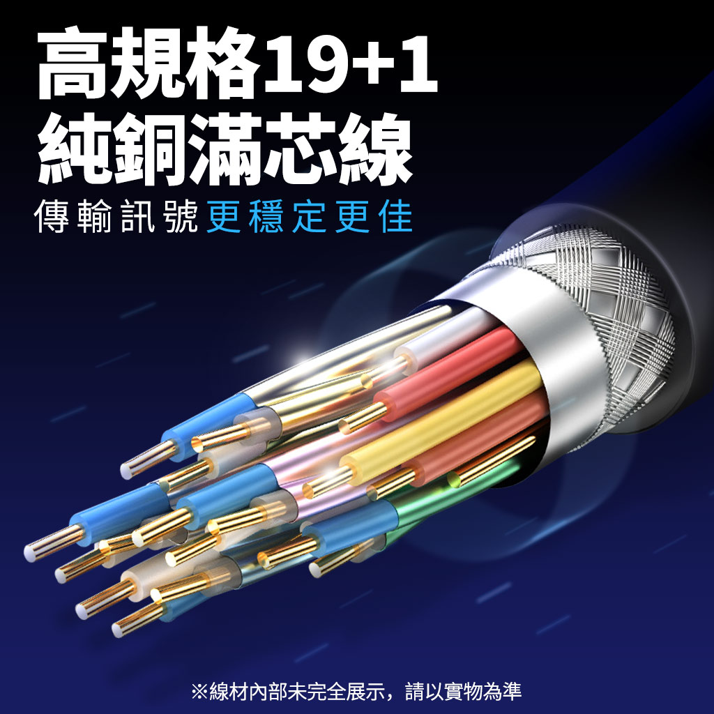 產品特色包含24K鍍金接頭設計,有效抗氧化並提升耐用度,高規格19+1純銅滿芯線材結構,確保訊號傳輸穩定且品質優異。耐插拔設計讓產品使用壽命極高,即使多次插拔也不會影響傳輸效能。