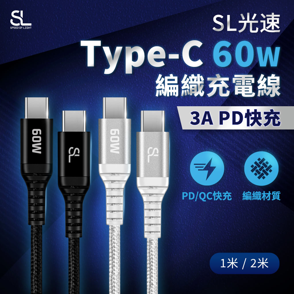 SL光速 Type-C 60W 編織充電線 3A PD快充傳輸線