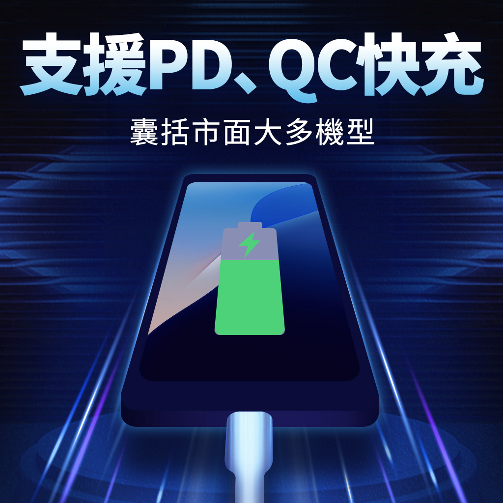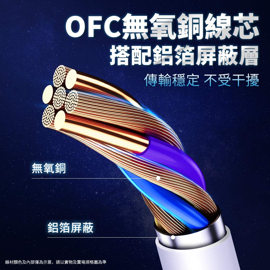 採用OFC無氧銅線芯,搭配鋁箔屏蔽層設計,提供穩定高速傳輸且不受干擾。支援3A PD快充及QC等主流快充協議,相容市面大多數機型,滿足手機、平板、筆電等設備快速充電需求。